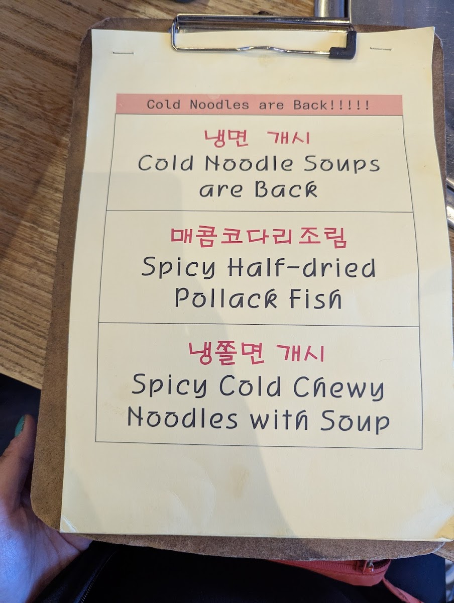 If you're craving something sizzling, the Hot Plate section has the 고추장제육 (Spicy Pork Belly), offering a perfect balance of spicy and savory. Moving on to the Noodles section, the 얼큰포장마차우동 (Spicy Udon) and Spicy Cold Noodles With Porkbelly are exciting choices that bring bold flavors with a mix of textures, while the Spicy Kimchi Noodles With Porkbelly caters to those who enjoy the tangy taste of kimchi.